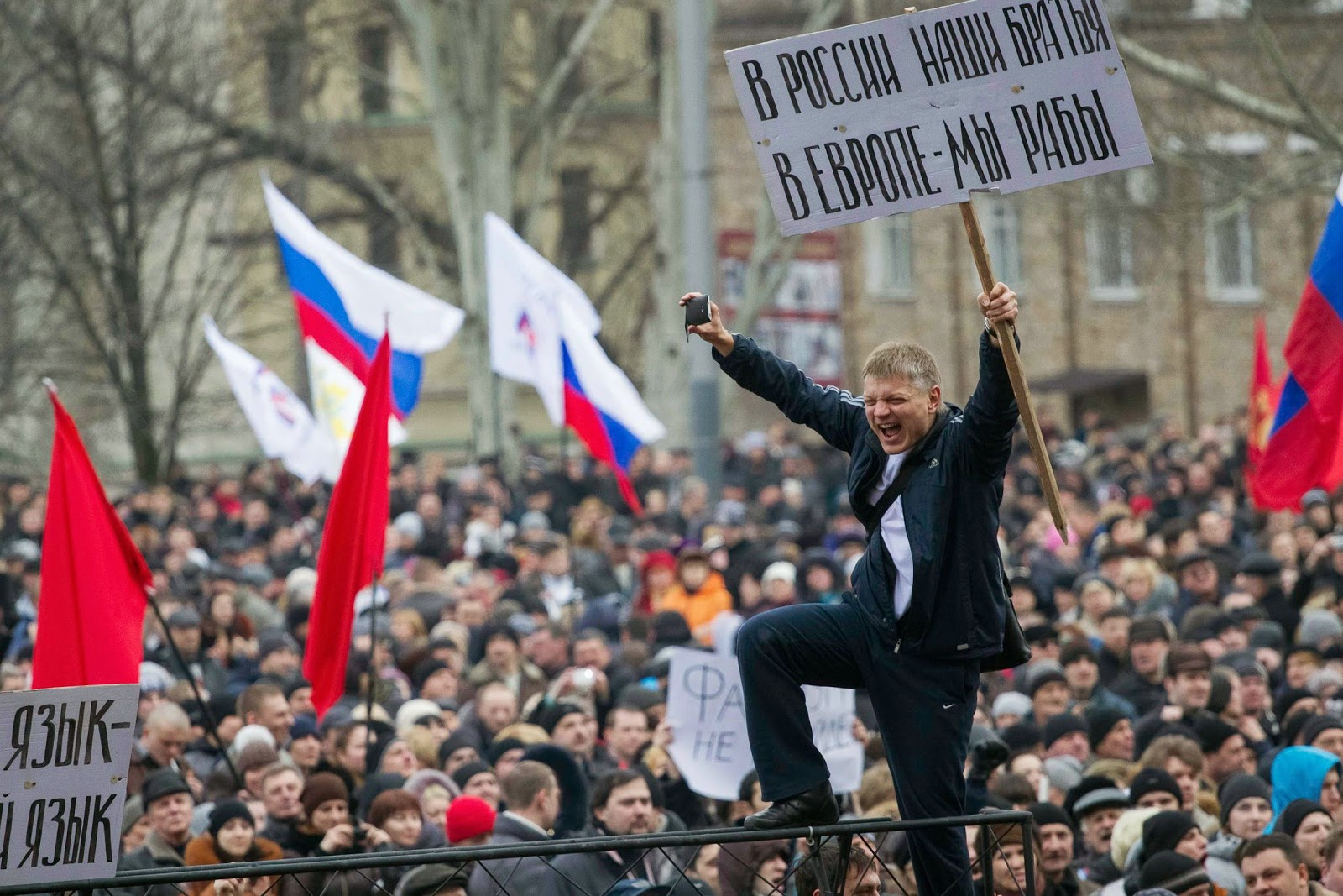 Dozens of men dressed in military fatigues and wielding baseball bats waded into the rally of some 2,000 people in Donetsk, heart of a separatist uprising against Kiev, according to Reuters. They lobbed fire-crackers and what appeared to be at least one stun grenade.